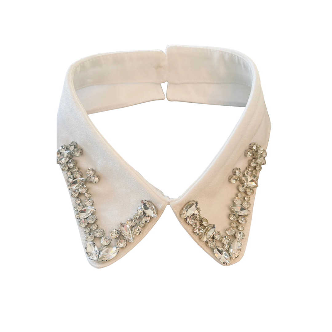 Den här eleganta löskragen är detaljen som direkt lyfter din outfit. Tillverkad i vitt tyg och rikt dekorerad med gnistrande stenar som ger en exklusiv och feminin känsla. Perfekt när du vill addera något extra utan att byta hela looken.