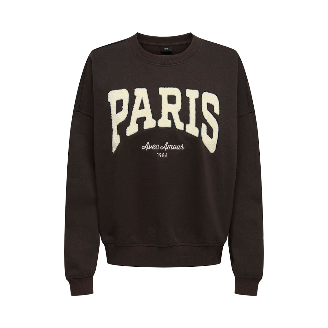 Mörkbrun sweatshirt med trendigt PARIS-tryck i teddy – en detalj som gör tröjan både stilfull och mysig. Den mjuka bomullsmixen gör den bekväm hela dagen, samtidigt som den ger en sportig och avslappnad look.
